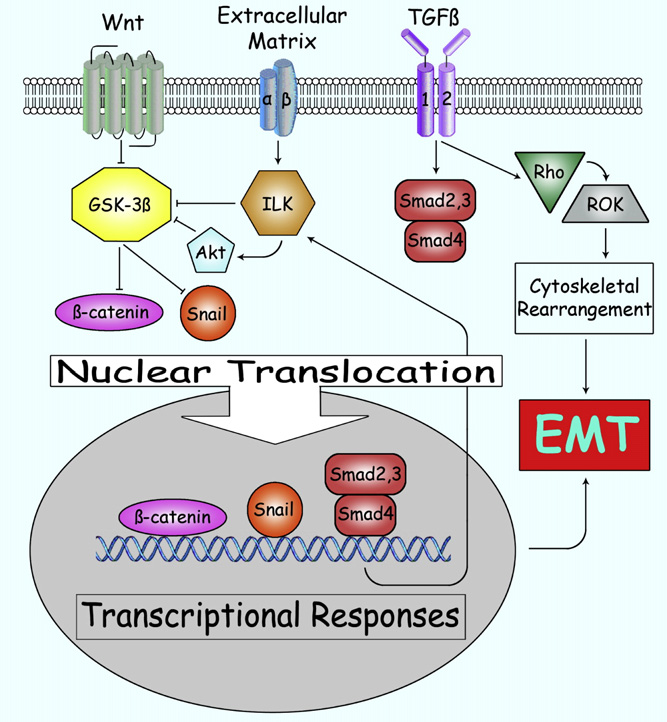 Growth Factor Signaling Pathways: The ECM can bind and store various growth factors, such as TGF-β and EGF. When the ECM is degraded or remodeled, these growth factors are released and bind to cell surface receptors, activating corresponding signaling pathways. For example, TGF-β activates the Smad pathway, promoting the expression of EMT-related transcription factors while suppressing epithelial markers, thereby inducing EMT.