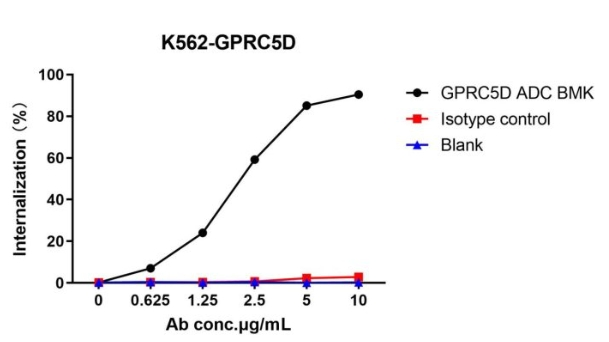 The fluorescent signal from GPRC5D ADC BMK-UA070080 conjugate is only detected in GPRC5D positive cells (K562-GPRC5D stable expression cell line), indicating specific internalization.