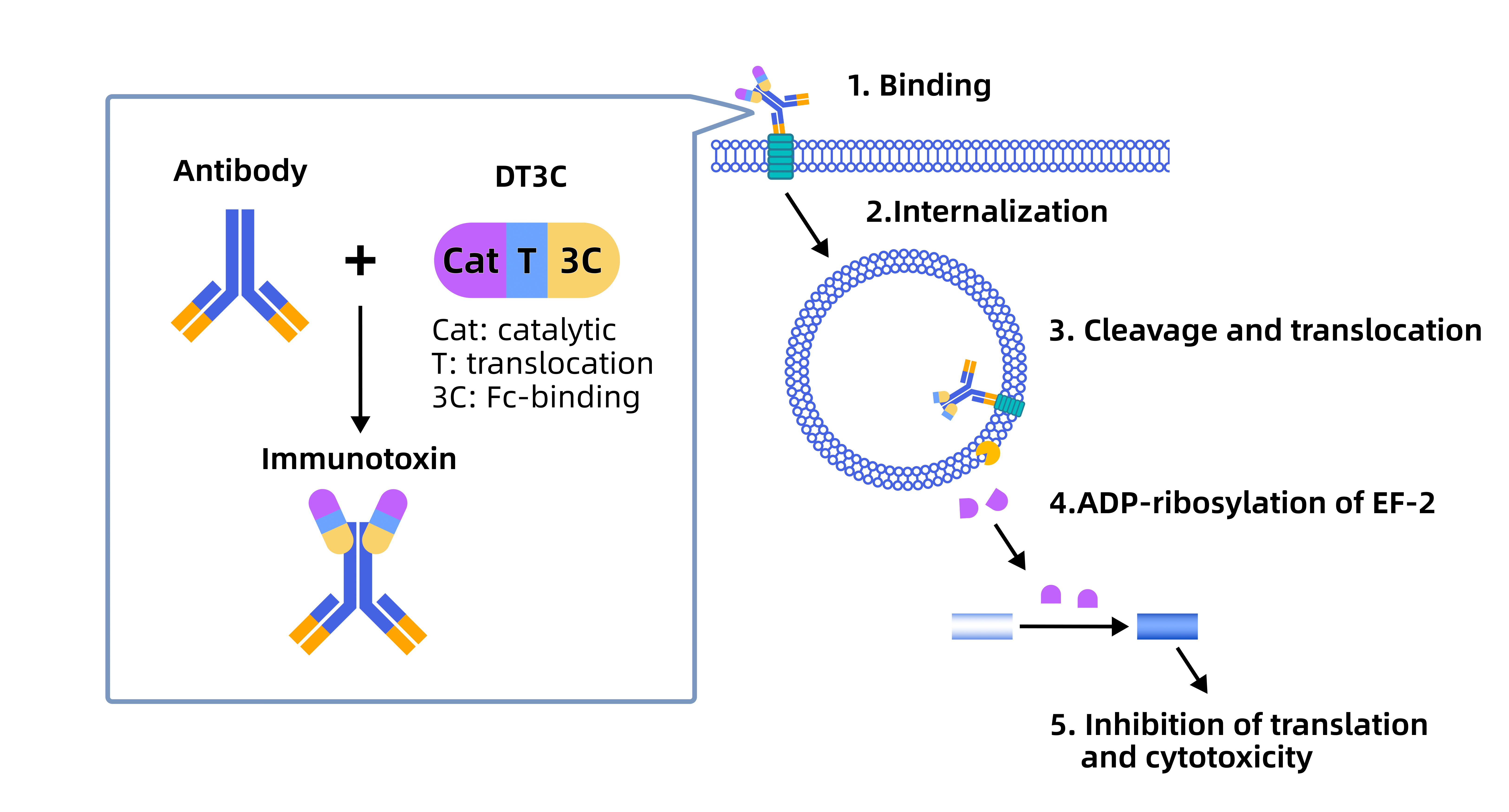 After the mAb-DT3C coupling complex recognizes and binds to the cell surface antigen, the mAb-DT3C-antigen complex is internalized. The translocation end of DT3C is cleaved by the cell furin protease, and the catalytic domain of DT3C is released into the cytoplasm. DT3C releases toxic DT, which can inhibit the activity of EF2-ADP ribosylation, block the protein translation process, and ultimately lead to cell death.