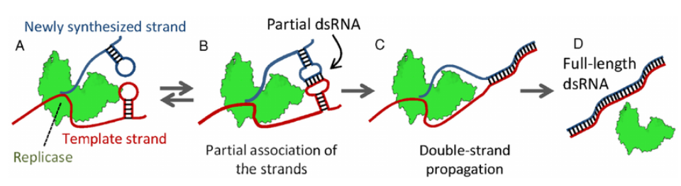 dsRNA is often regarded as a hallmark of viral infection, as many viruses (especially double-stranded RNA viruses) use dsRNA as their genome or replication intermediates. For example, positive-sense RNA viruses (+ssRNA) synthesize negative-sense RNA (-ssRNA) during replication, forming dsRNA, which is then used to produce more positive-sense RNA.