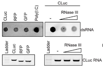Figure 3: Formation of 3'-extended RNA byproducts during IVT reactions. (A) dsRNA detection using the dsRNA-specific antibody (J2) for three different mRNA sequences (CLuc, RFP, and GFP).