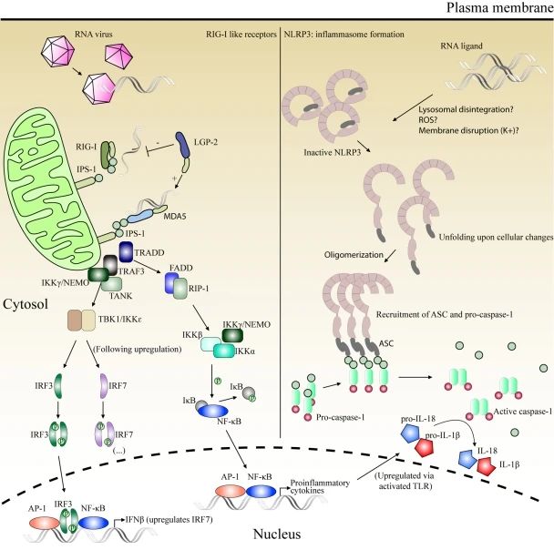 Figure 4: dsRNA acts as a molecular pattern recognized by RIG-I (Retinoic Acid-Inducible Gene I) and MDA5 (Melanoma Differentiation-Associated Protein 5), initiating innate immune responses.