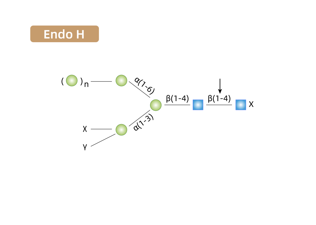 Endo H can cleave the chitobiose core structure of high mannose in N-glycoproteins and some hybrid oligosaccharides, removing N-linked high mannose in glycoproteins. It is used in research to analyze the glycosylation pattern of glycoproteins, especially when studying high mannose glycans.