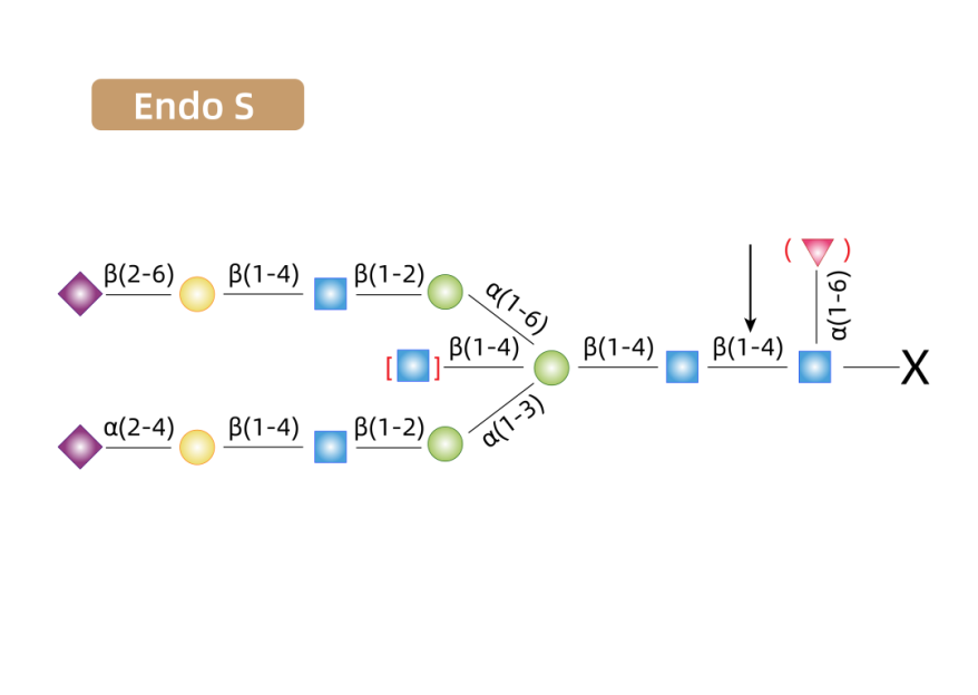 Endo S is a highly specific endoglycosidase that cleaves N-linked sugars from between the chitobiose core structures of IgG heavy chains. Endo S is very useful for studying the glycosylation pattern of IgG and its effect on antibody function.