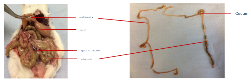 2) As shown in the figure below, cut at the junction of the mouse stomach and duodenum, while separating the adipose tissue and mesentery around the small intestine, pull out the small intestine, and then cut it at the junction of the small intestine and cecum to isolate the small intestine.