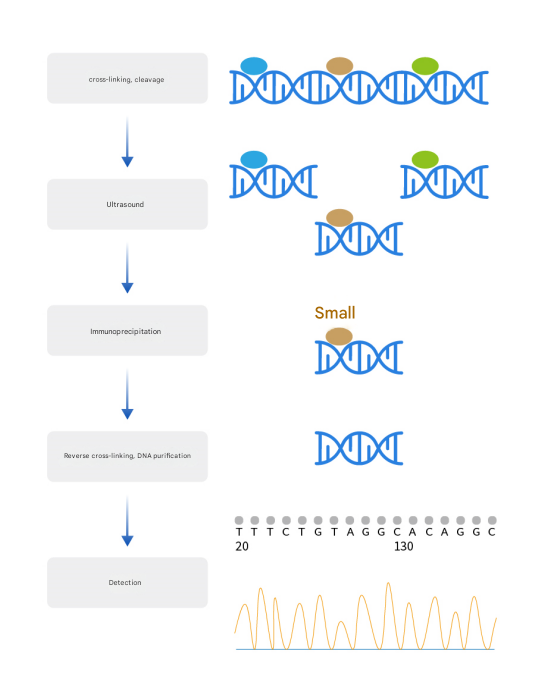 Chromatin immunoprecipitation (ChIP) is a molecular biology technique used to study protein-DNA interactions. DNA that interacts with proteins is isolated from complexes using specific antibodies to known proteins, and is commonly used to determine the binding sites of specific transcription factors or other chromatin-binding proteins on the genome and how these proteins regulate gene expression.