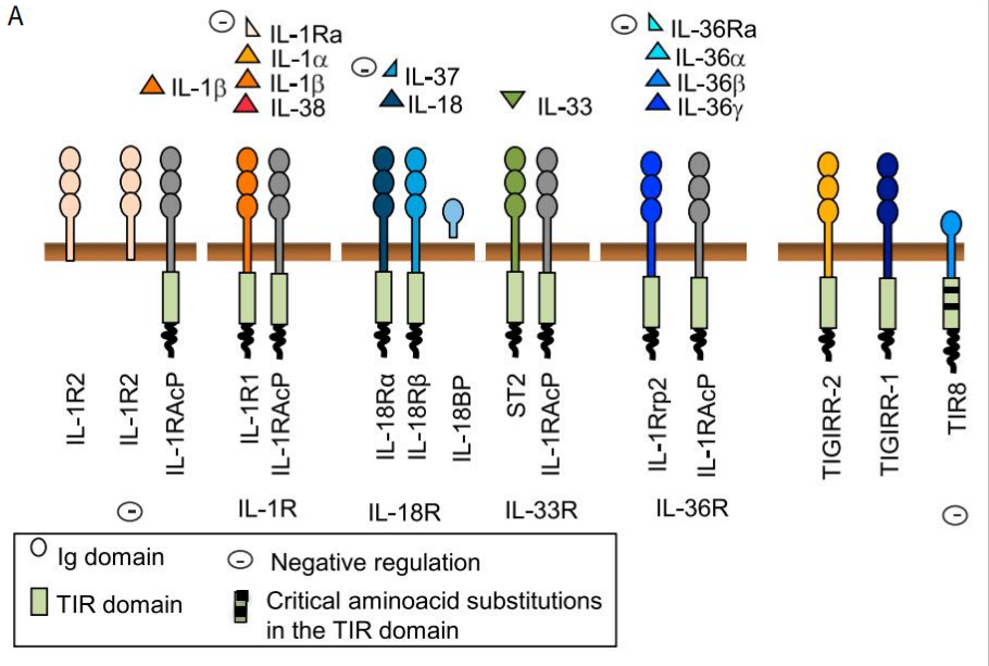 Ligands and Receptors in the IL-1 FamilyA schematic representation of ligands and receptor chains in the IL-1 family. The minus sign indicates inhibition.