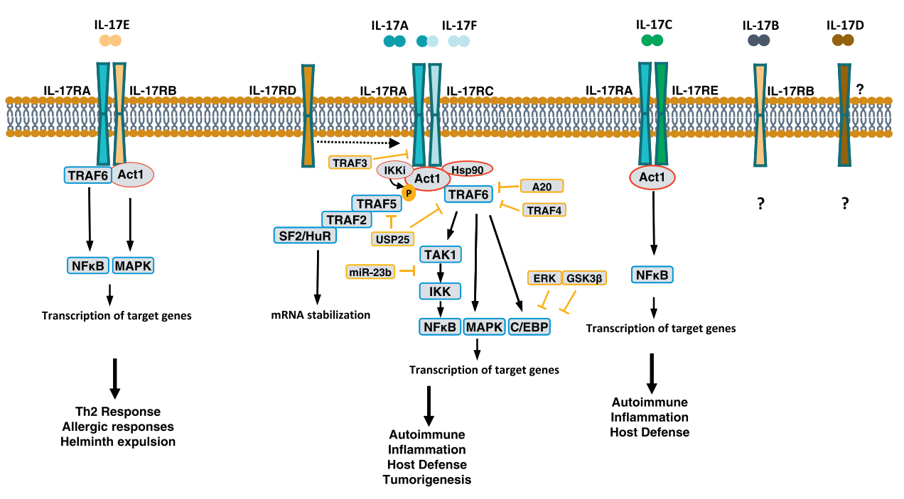 The IL-17 family consists of six members (IL-17A-F), while the IL-17 receptor family comprises five members (IL-17RA to IL-17RE). IL-17RA is a common receptor that can form heterodimeric complexes with IL-17RB, IL-17RC, and IL-17RE. All IL-17 receptors recruit Act1 as an adaptor molecule for downstream signaling. IL-17A and IL-17F signal through the IL-17RA-RC complex, triggering TRAF6-dependent target gene transcription and TRAF6-independent IKKi-dependent mRNA stabilization, both of which are important for host defense and contribute to the pathogenesis of autoimmune diseases and cancer. IL-17 signaling is tightly regulated at various levels of the signaling cascade. At the receptor level, IL-17RD interacts with Act1, sequestering it from IL-17RA and TRAF6 until IL-17 stimulation. TRAFs such as TRAF3 and TRAF4 disrupt downstream signaling complex formation. TRAF3 binds to IL-17R to prevent Act1 and TRAF6 recruitment, while TRAF4 competes with TRAF6 for Act1 binding. Deubiquitinating enzymes such as USP25 and A20 regulate the ubiquitination status of TRAFs (e.g., TRAF5 and TRAF6), thereby suppressing the signaling cascade. IL-17A-dependent micro-RNA (miR-23b) regulates NF-κB activation. IL-17A-induced transcription factors (e.g., C/EBPδ) suppress inflammatory gene expression. IL-17E (IL-25) signals through the IL-17RA-RB receptor complex, inducing Th2 responses via activation of MAPK and NF-κB pathways. IL-17C signals through the IL-17RA-RE complex, mediating host defense and contributing to autoimmune disease pathogenesis, similar to IL-17A. IL-17B has been shown to interact with IL-17RB, but its biological functions remain unclear. The receptor for IL-17D is unknown.