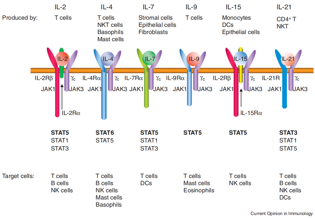 Receptors of IL-2, IL-4, IL-7, IL-9, IL-15, and IL-21.The figure illustrates the receptors for IL-2, IL-4, IL-7, IL-9, IL-15, and IL-21. These cytokines activate STAT proteins through phosphorylation of JAK1 and JAK3. The primary STAT proteins activated by each cytokine are indicated in bold. DC, dendritic cells; NK cells, natural killer cells; NKT cell, natural killer T cells. STAT5 refers to both STAT5A and STAT5B, closely related head-to-head tandem genes.