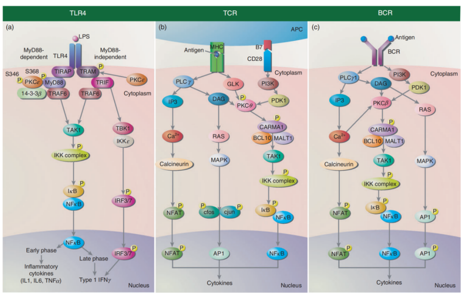 Pathway C: Similar to TCR signaling, B cells are activated when antigens bind to the B cell receptor (BCR), with PKCβ being the key PKC isoform involved. Calcium (Ca2+) produced by PLCγ1 activation can also activate PKCβ. Both TCR and BCR signaling pathways lead to the recruitment and activation of nuclear transcription factors (NF-κB, AP1, and NFAT), resulting in cytokine production.