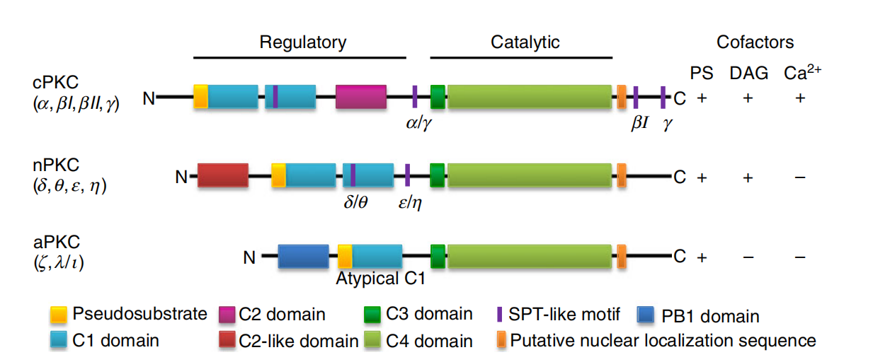Figure: Schematic diagram of the structure of Protein Kinase C (PKC) family members.