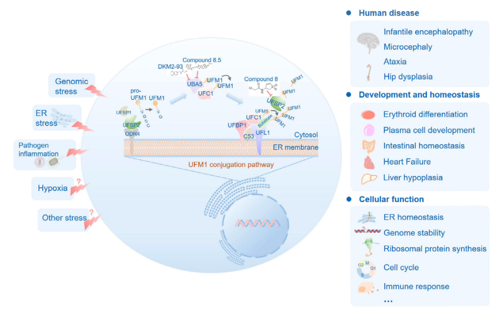 The UFMylation system also acts as a bridge between the endocrine and immune systems: it regulates ER transport of adrenergic receptors, maintaining stress response balance; enhances estrogen receptor stability, influencing reproductive-related immunity; and is highly expressed in the pancreas, protecting pancreatic β cells from ER stress-induced apoptosis, revealing its potential role in metabolic diseases.