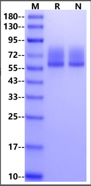 Expressed in eukaryotic HEK293 cells, the protein structure closely resembles the native conformation.