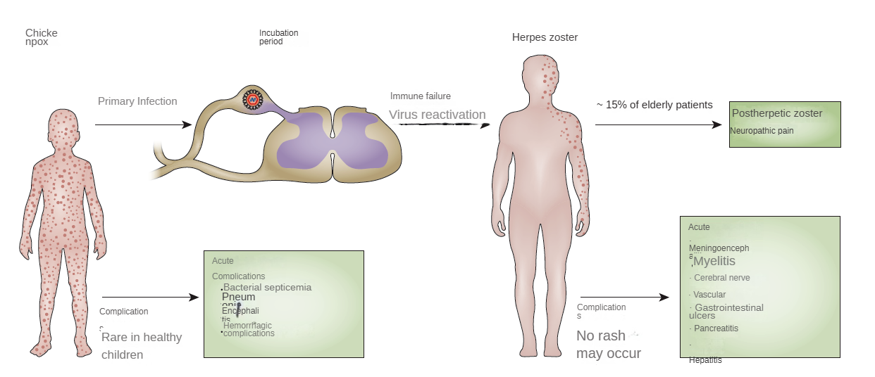 Primary infection with VZV in susceptible individuals results in varicella, which is typically benign in healthy children as their immune systems can control the infection. VZV establishes latency in ganglion cells, and reactivation of the virus leads to herpes zoster, characterized by viral replication and spread to the skin areas innervated by these neurons. Aging and immunocompromised status are risk factors for complications of VZV infection. However, some complications, such as postherpetic neuralgia, can occur even in the absence of these risk factors.