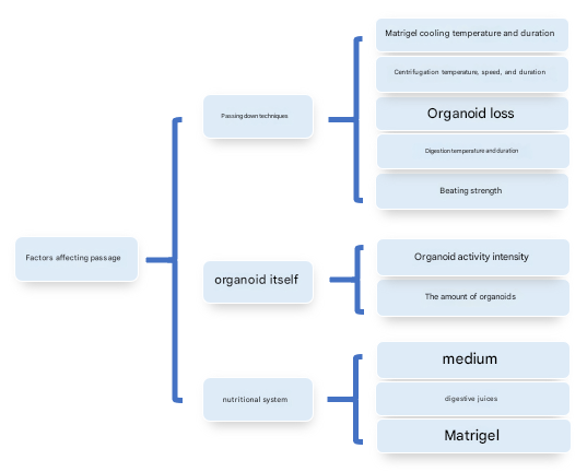 The most important factor influencing organoid passaging is the passaging technique. In particular, some delicate organoids, like flowers in a greenhouse, cannot withstand any "wind and rain", such as the matrigel cooling conditions (temperature and length), centrifugation conditions (temperature, speed, duration), the loss of organoids when discarding the supernatant, digestion conditions (temperature, duration), and blowing intensity are "ninety-nine eighty-one difficulties on the road to learning scriptures in the west".