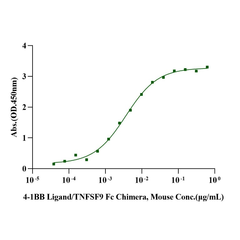 Immobilized 4-1BB/TNFRSF9 His Tag Protein, Mouse(Cat. No. UA010785) at 2.0μg/mL (100μL/well) can bind 4-1BB Ligand/TNFSF9 Fc Chimera, Mouse(Cat. No. UA010783) with EC50 of 3.11-4.30 ng/ mL.