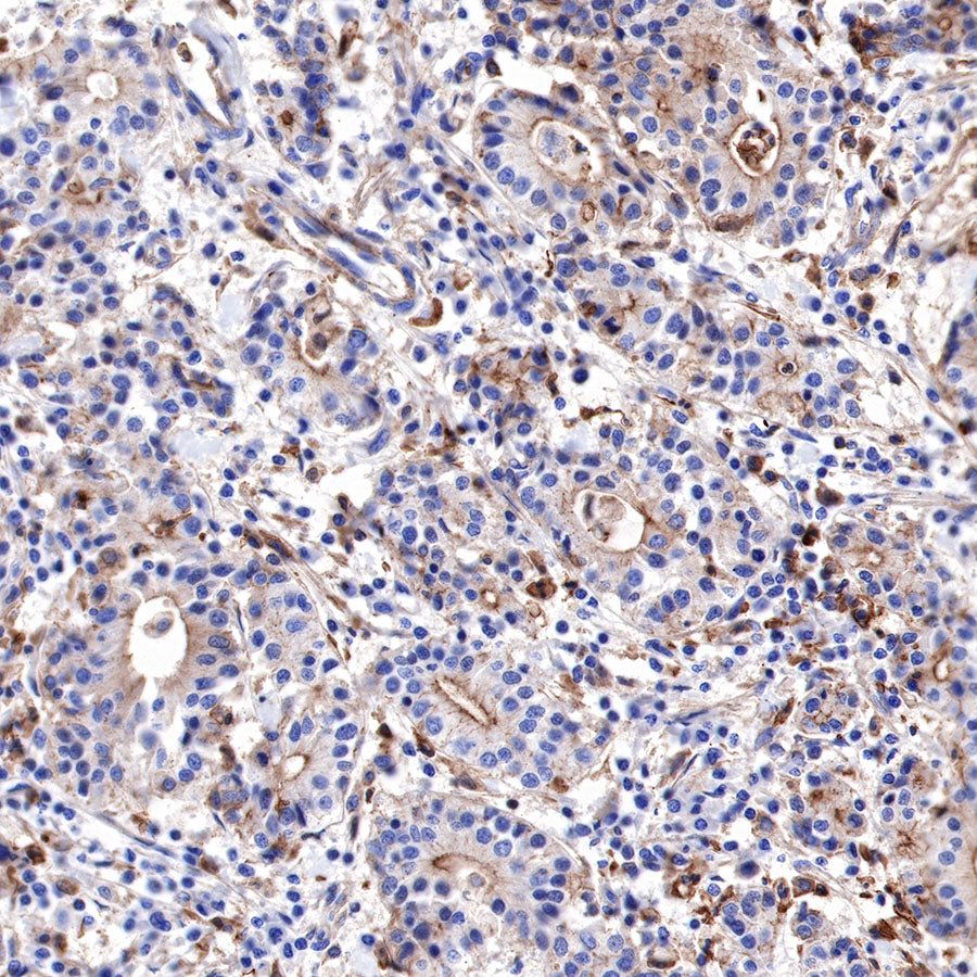 IHC shows positive staining in paraffin-embedded human pancreatic cancer. Anti-α-Actinin-1 antibody was used at 1/2000 dilution, followed by a HRP Polymer for Mouse & Rabbit IgG (ready to use). Counterstained with hematoxylin. Heat mediated antigen retrieval with Tris/EDTA buffer pH9.0 was performed before commencing with IHC staining protocol.