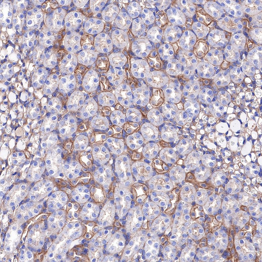 IHC shows positive staining in paraffin-embedded mouse kidney. Anti-α-Actinin-1 antibody was used at 1/2000 dilution, followed by a HRP Polymer for Mouse & Rabbit IgG (ready to use). Counterstained with hematoxylin. Heat mediated antigen retrieval with Tris/EDTA buffer pH9.0 was performed before commencing with IHC staining protocol.