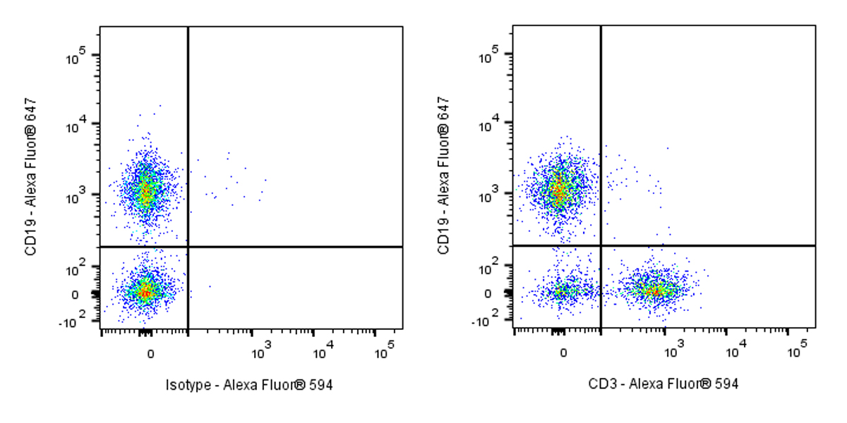 Flow cytometric analysis of Mouse CD3 expression on C57BL/6 mouse splenocytes. C57BL/6 mouse splenocytes were stained with Alexa Fluor 647 Rat Anti-Mouse CD19 antibody and either Alexa Fluor® 594 Rat IgG2b Isotype Control (Left panel) or SDT Alexa Fluor® 594 Rat Anti-Mouse CD3 Antibody (17A2) (Right panel) at 1 μg/test. Flow cytometry and data analysis were performed using BD FACSymphony™ A1 and FlowJo™ software.