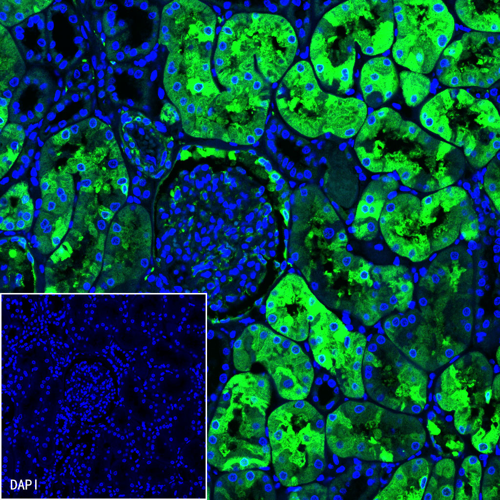IF shows positive staining in paraffin-embedded human kidney. Anti-Alpha B Crystallin antibody was used at 1/500 dilution (Green) and incubated overnight at 4°C. Goat polyclonal Antibody to Rabbit IgG - H&L (Alexa Fluor® 488) (S0B4004) was used as secondary antibody at 1/500 dilution. Counterstained with DAPI (Blue). Heat mediated antigen retrieval with EDTA buffer pH9.0 was performed before commencing with IF staining protocol.
