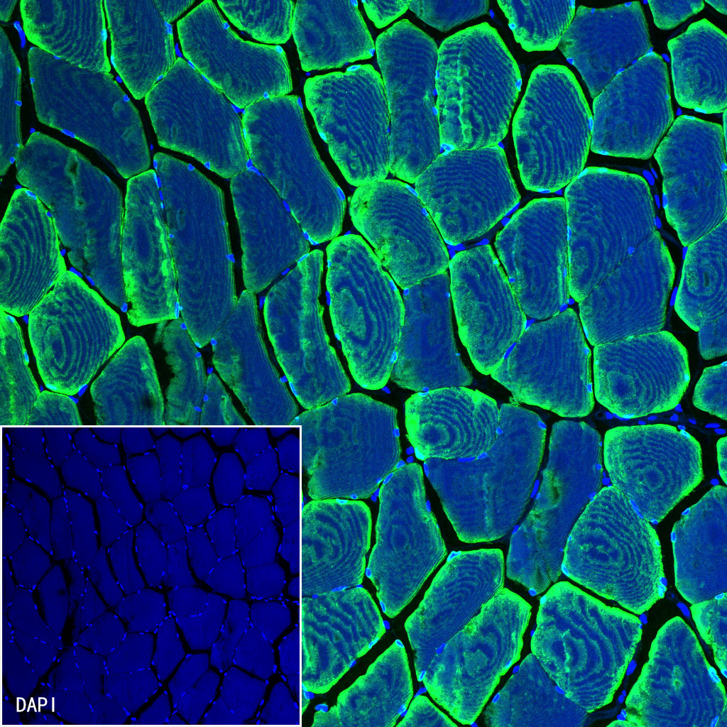 IF shows positive staining in paraffin-embedded human skelestal muscle. Anti-Alpha B Crystallin antibody was used at 1/500 dilution (Green) and incubated overnight at 4°C. Goat polyclonal Antibody to Rabbit IgG - H&L (Alexa Fluor® 488) (S0B4004) was used as secondary antibody at 1/500 dilution. Counterstained with DAPI (Blue). Heat mediated antigen retrieval with EDTA buffer pH9.0 was performed before commencing with IF staining protocol.