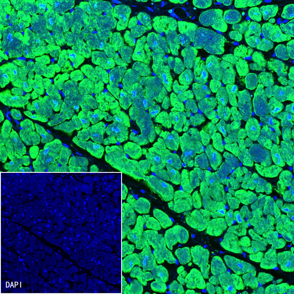 IF shows positive staining in paraffin-embedded human cardiac muscle. Anti-Alpha B Crystallin antibody was used at 1/500 dilution (Green) and incubated overnight at 4°C. Goat polyclonal Antibody to Rabbit IgG - H&L (Alexa Fluor® 488) (S0B4004) was used as secondary antibody at 1/500 dilution. Counterstained with DAPI (Blue). Heat mediated antigen retrieval with EDTA buffer pH9.0 was performed before commencing with IF staining protocol.
