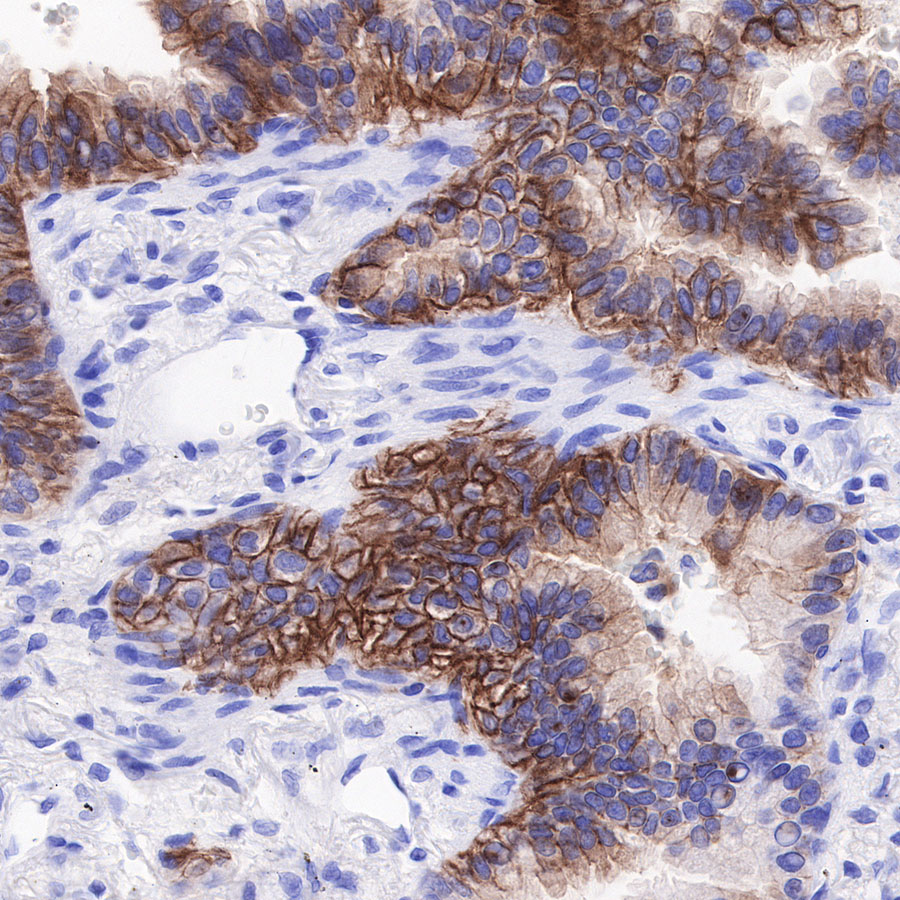 IHC shows positive staining in paraffin-embedded human lung cancer. Anti-Claudin18.2 + Claudin18.1 antibody was used at 1/1000 dilution, followed by a HRP Polymer for Mouse & Rabbit IgG (ready to use). Counterstained with hematoxylin. Heat mediated antigen retrieval with Tris/EDTA buffer pH9.0 was performed before commencing with IHC staining protocol.