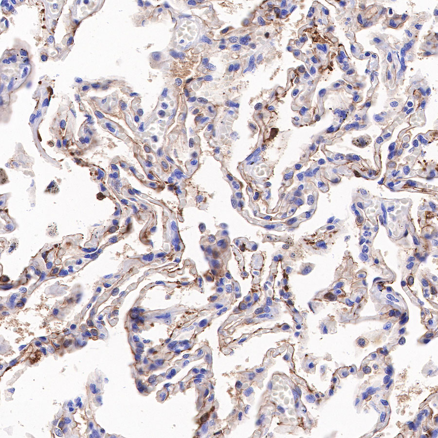 IHC shows positive staining in paraffin-embedded human lung. Anti-Claudin18.2 + Claudin18.1 antibody was used at 1/1000 dilution, followed by a HRP Polymer for Mouse & Rabbit IgG (ready to use). Counterstained with hematoxylin. Heat mediated antigen retrieval with Tris/EDTA buffer pH9.0 was performed before commencing with IHC staining protocol.