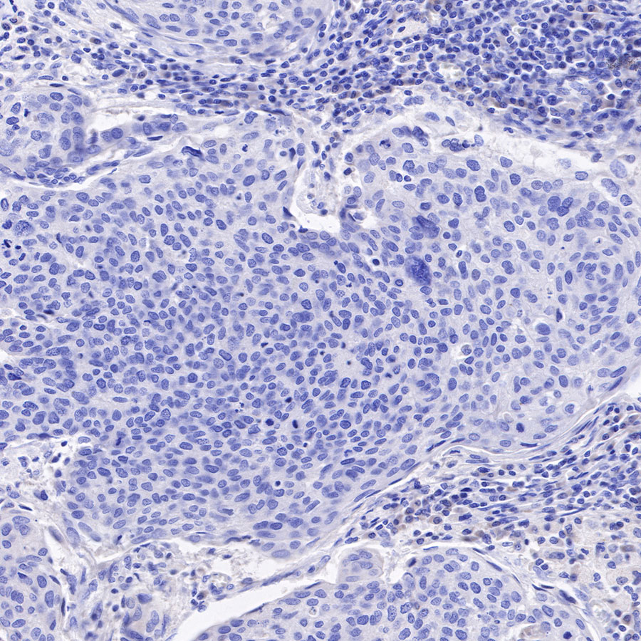 Negative control: IHC shows negative staining in paraffin-embedded human cervical squamous cell carcinoma. Anti-Claudin18.2 + Claudin18.1 antibody was used at 1/1000 dilution, followed by a HRP Polymer for Mouse & Rabbit IgG (ready to use). Counterstained with hematoxylin. Heat mediated antigen retrieval with Tris/EDTA buffer pH9.0 was performed before commencing with IHC staining protocol.