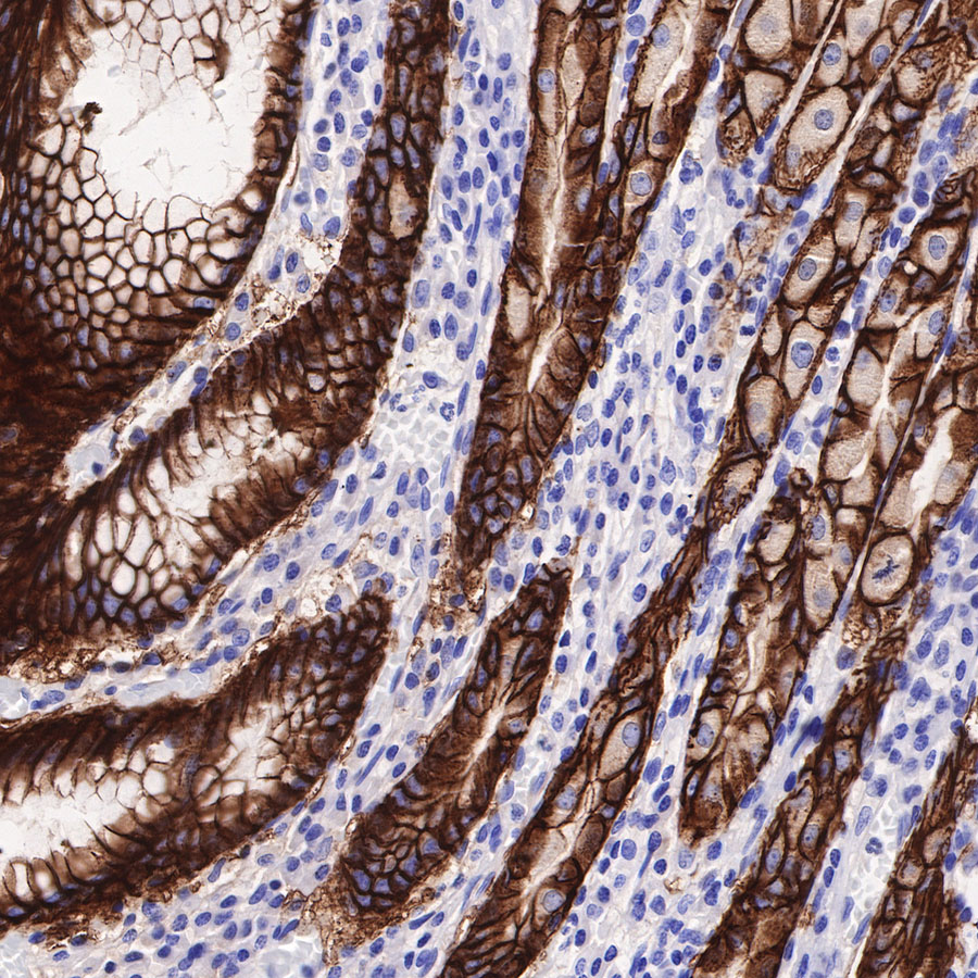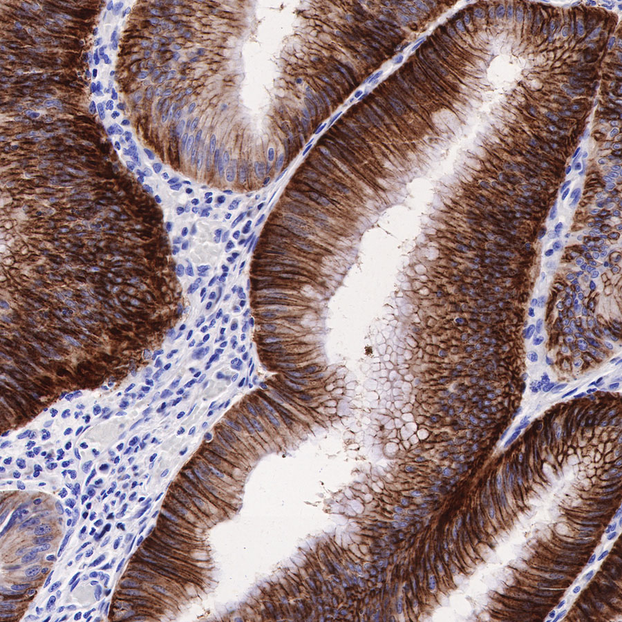 IHC shows positive staining in paraffin-embedded human colon cancer. Anti-Claudin18.2 + Claudin18.1 antibody was used at 1/1000 dilution, followed by a HRP Polymer for Mouse & Rabbit IgG (ready to use). Counterstained with hematoxylin. Heat mediated antigen retrieval with Tris/EDTA buffer pH9.0 was performed before commencing with IHC staining protocol