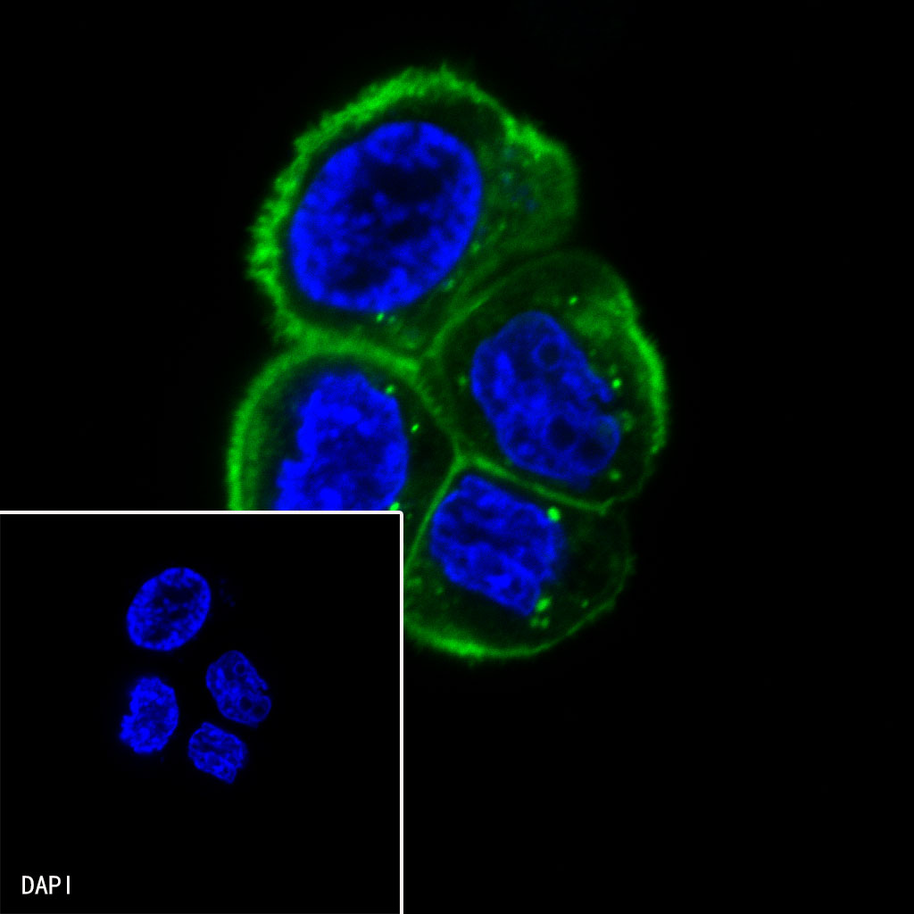 ICC shows positive staining in KATOIII cells. Anti-Claudin18.2 + Claudin18.1 antibody was used at 1/500 dilution (Green) and incubated overnight at 4°C. Goat polyclonal Antibody to Rabbit IgG - H&L (Alexa Fluor® 488) was used as secondary antibody at 1/1000 dilution. The cells were fixed with 4%PFA and permeabilized with 0.1% PBS-Triton X-100. Nuclei were counterstained with DAPI (Blue).