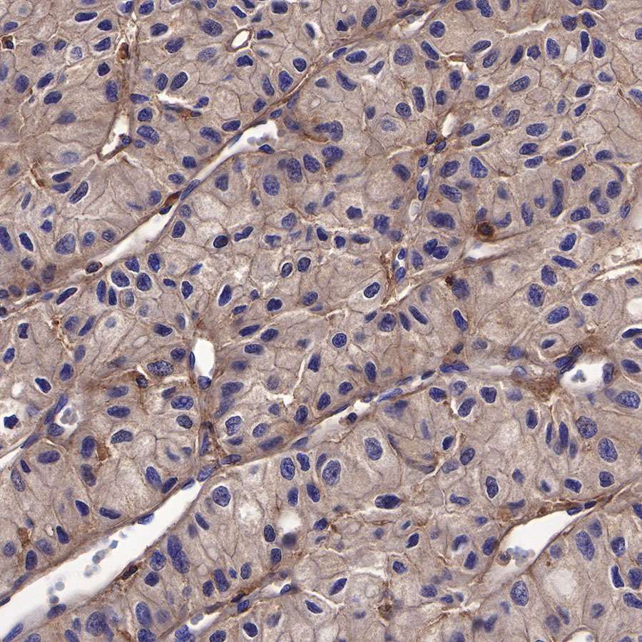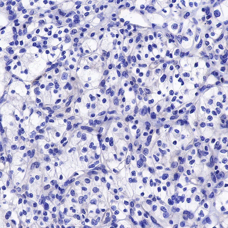 Negative control: IHC shows negative staining in paraffin-embedded human renal clear cell carcinoma. Anti-Galectin-3 antibody was used at 1/2500 dilution, followed by a HRP Polymer for Mouse & Rabbit IgG (ready to use). Counterstained with hematoxylin. Heat mediated antigen retrieval with Tris/EDTA buffer pH9.0 was performed before commencing with IHC staining protocol.