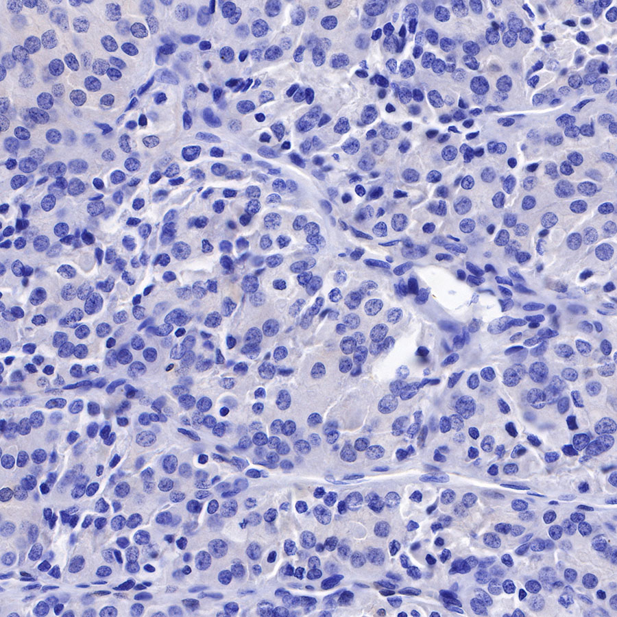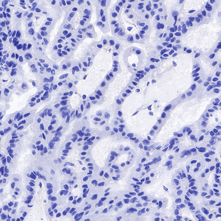 Negative control: IHC shows negative staining in paraffin-embedded human papillary renal cell carcinoma. Anti-Galectin-3 antibody was used at 1/2500 dilution, followed by a HRP Polymer for Mouse & Rabbit IgG (ready to use). Counterstained with hematoxylin. Heat mediated antigen retrieval with Tris/EDTA buffer pH9.0 was performed before commencing with IHC staining protocol.