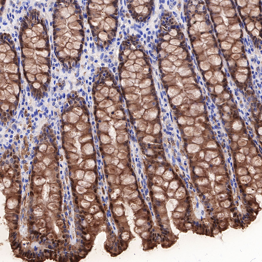 IHC shows positive staining in paraffin-embedded human colon. Anti-Galectin-3 antibody was used at 1/2500 dilution, followed by a HRP Polymer for Mouse & Rabbit IgG (ready to use). Counterstained with hematoxylin. Heat mediated antigen retrieval with Tris/EDTA buffer pH9.0 was performed before commencing with IHC staining protocol.