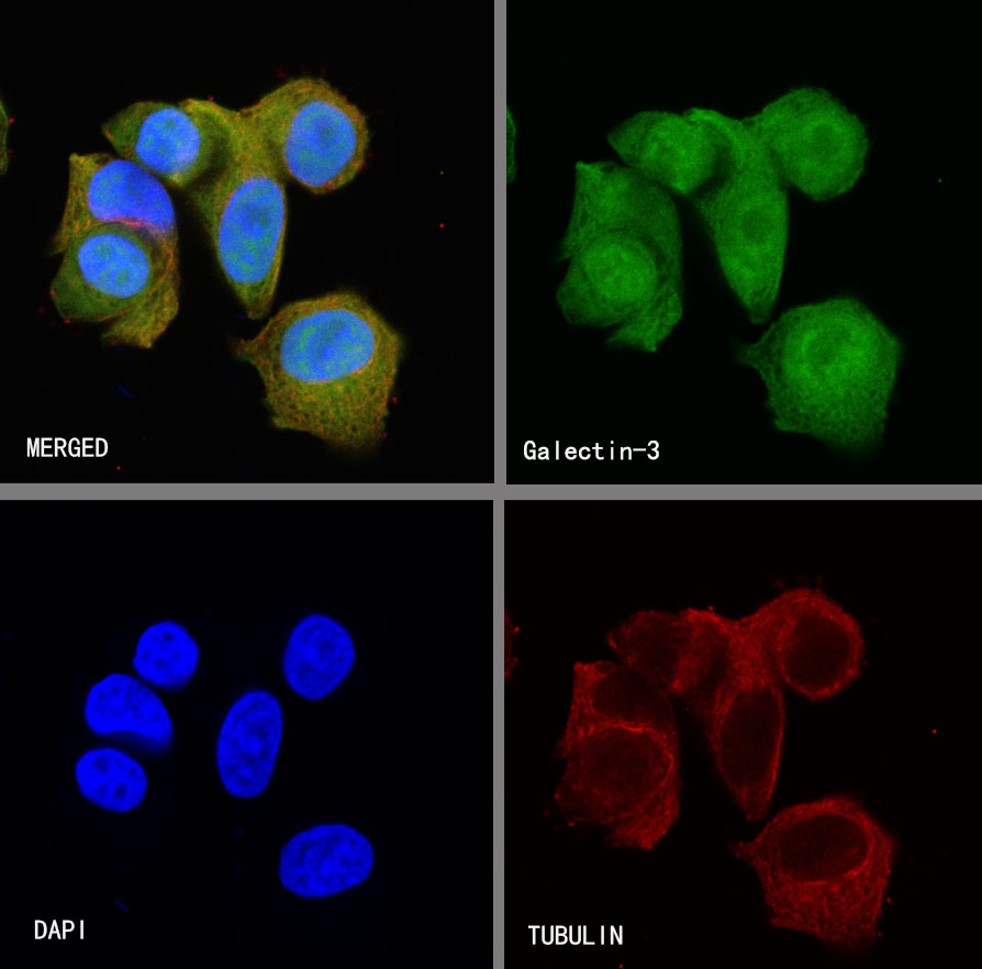 ICC shows positive staining in MCF7 cells. Anti-Galectin-3 antibody was used at 1/250 dilution (Green) and incubated overnight at 4°C. Goat polyclonal Antibody to Rabbit IgG - H&L (Alexa Fluor® 488) was used as secondary antibody at 1/1000 dilution. The cells were fixed with 4% PFA and permeabilized with 0.1% PBS-Triton X-100. Nuclei were counterstained with DAPI (Blue). Counterstain with tubulin (red).