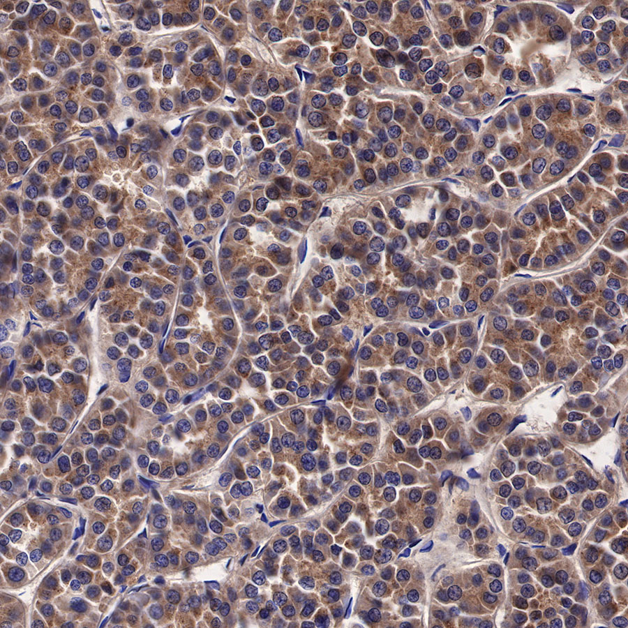 IHC shows positive staining in paraffin-embedded human oncocytic adenoma. Anti-Galectin-3 antibody was used at 1/2500 dilution, followed by a HRP Polymer for Mouse & Rabbit IgG (ready to use). Counterstained with hematoxylin. Heat mediated antigen retrieval with Tris/EDTA buffer pH9.0 was performed before commencing with IHC staining protocol.