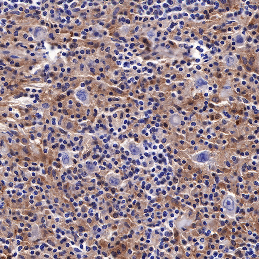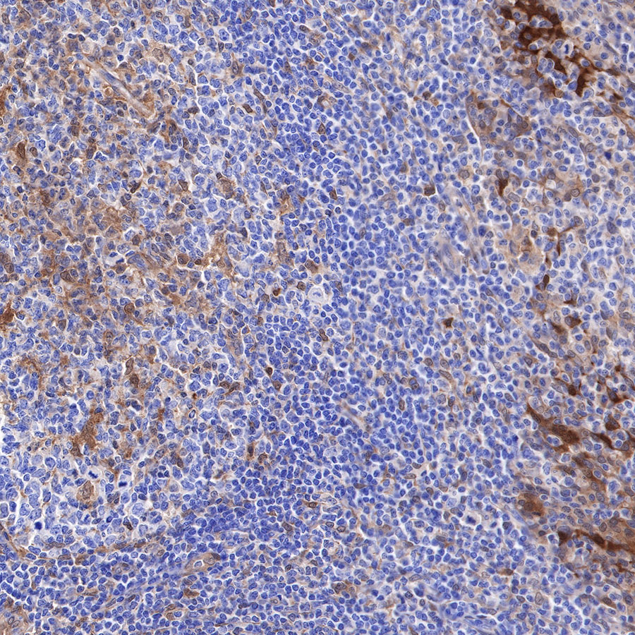 IHC shows positive staining in paraffin-embedded human Hodgkin's lymphoma. Anti-Galectin-3 antibody was used at 1/5000 dilution, followed by a HRP Polymer for Mouse & Rabbit IgG (ready to use). Counterstained with hematoxylin. Heat mediated antigen retrieval with Tris/EDTA buffer pH9.0 was performed before commencing with IHC staining protocol.