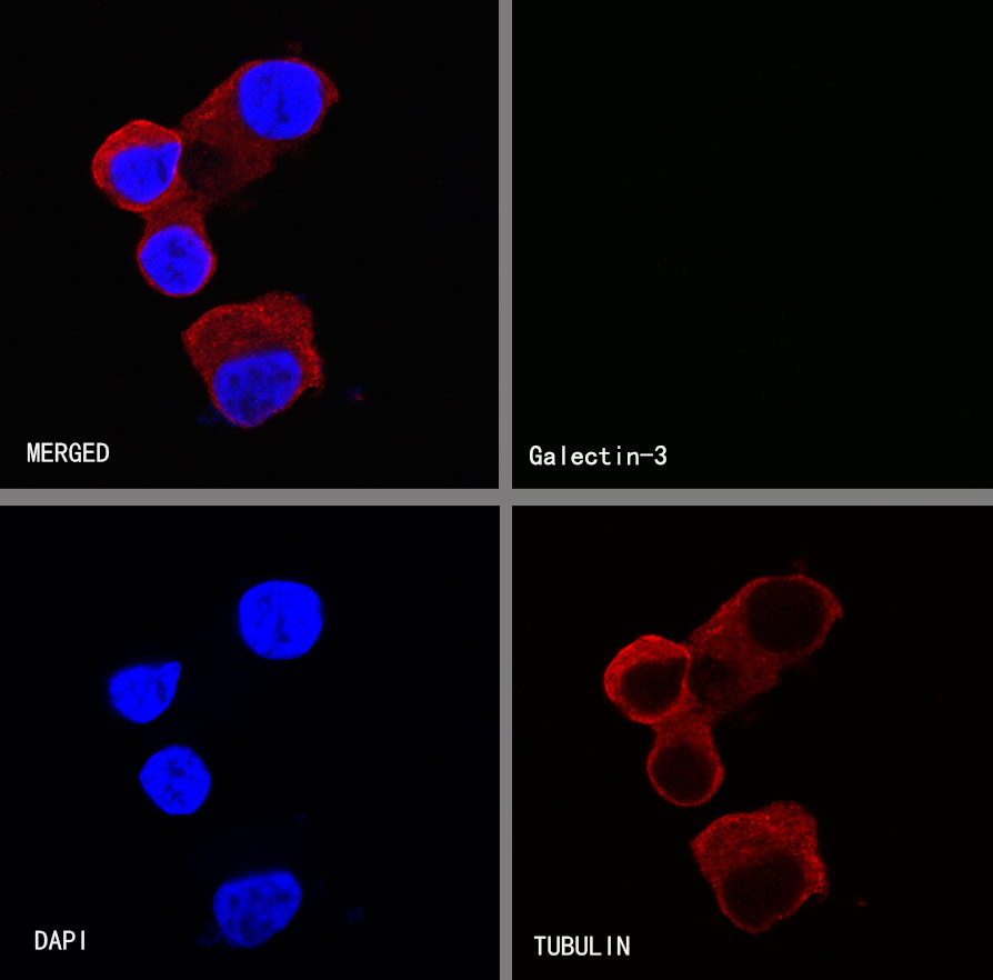 Negative control:ICC shows negative staining in LnCaP cells. Anti-Galectin-3 antibody was used at 1/250 dilution and incubated overnight at 4°C. Goat polyclonal Antibody to Rabbit IgG - H&L (Alexa Fluor® 488) was used as secondary antibody at 1/1000 dilution. The cells were fixed with 4% PFA and permeabilized with 0.1% PBS-Triton X-100. Nuclei were counterstained with DAPI (Blue). Counterstain with tubulin (red).