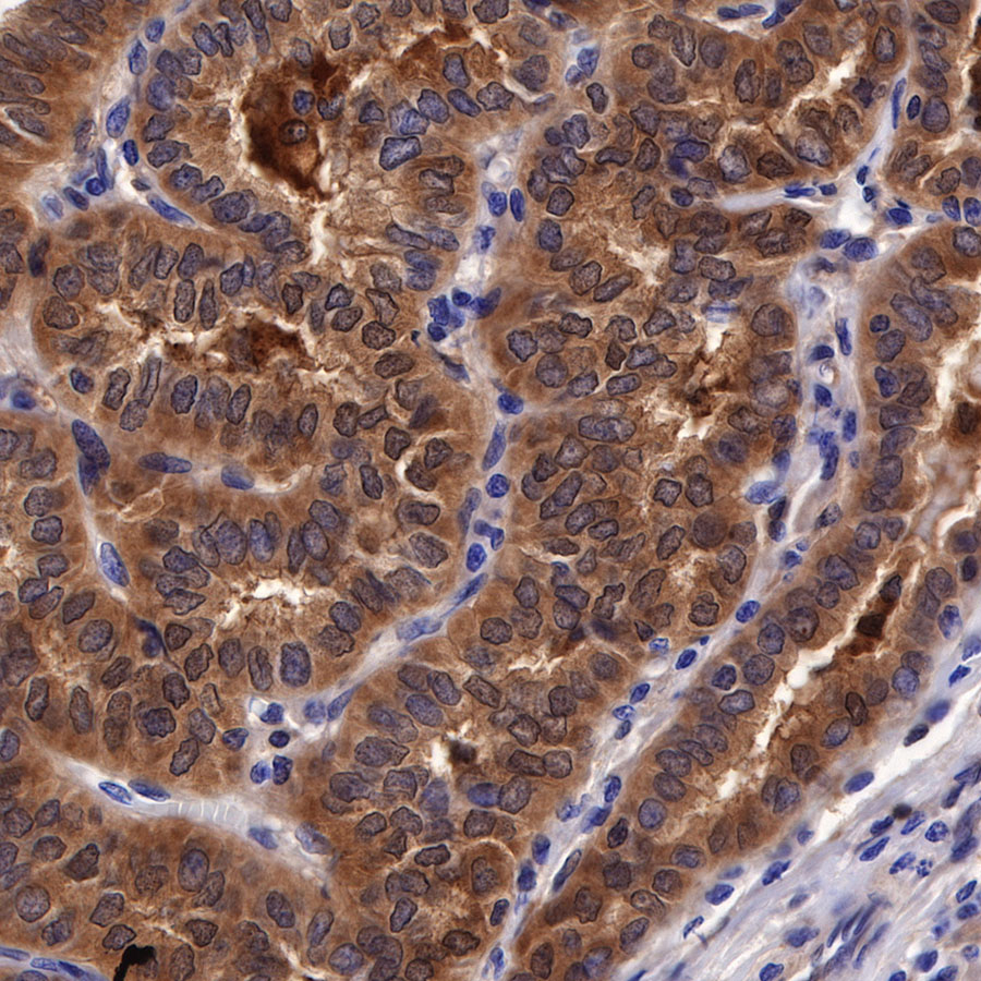 IHC shows positive staining in paraffin-embedded human papillary thyroid carcinoma. Anti-Galectin-3 antibody was used at 1/2500 dilution, followed by a HRP Polymer for Mouse & Rabbit IgG (ready to use). Counterstained with hematoxylin. Heat mediated antigen retrieval with Tris/EDTA buffer pH9.0 was performed before commencing with IHC staining protocol.