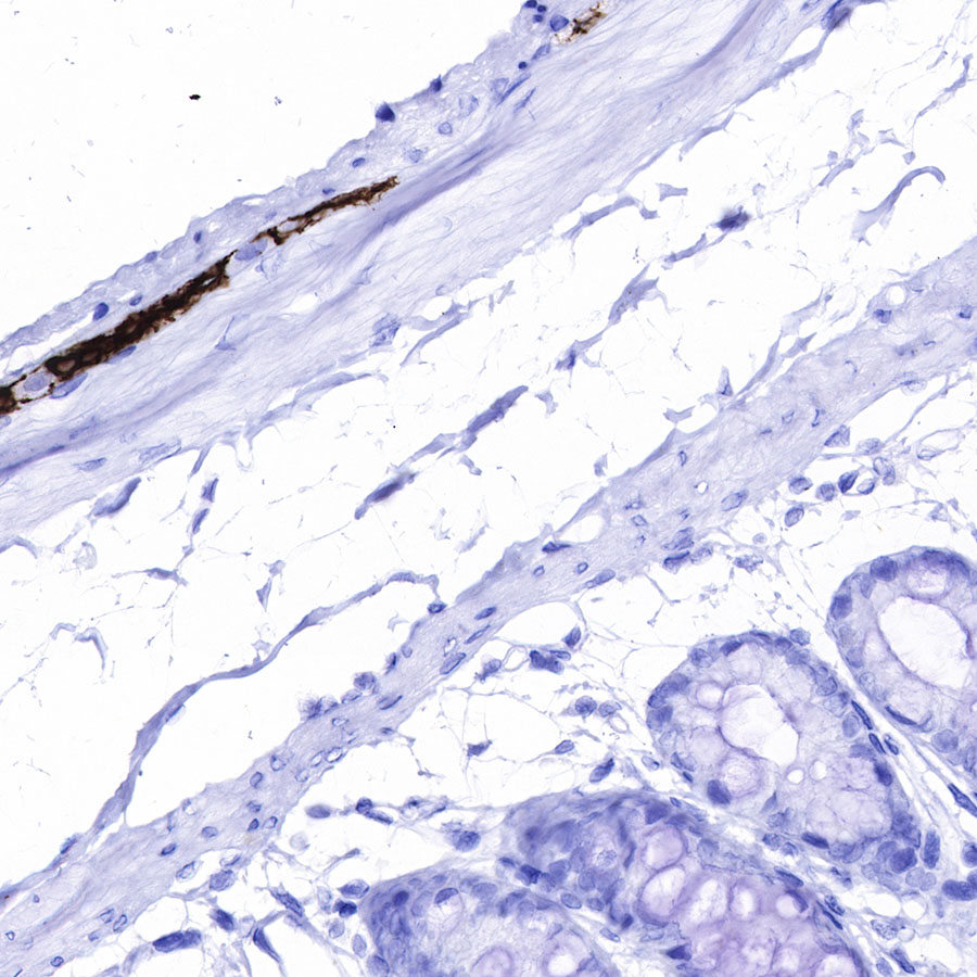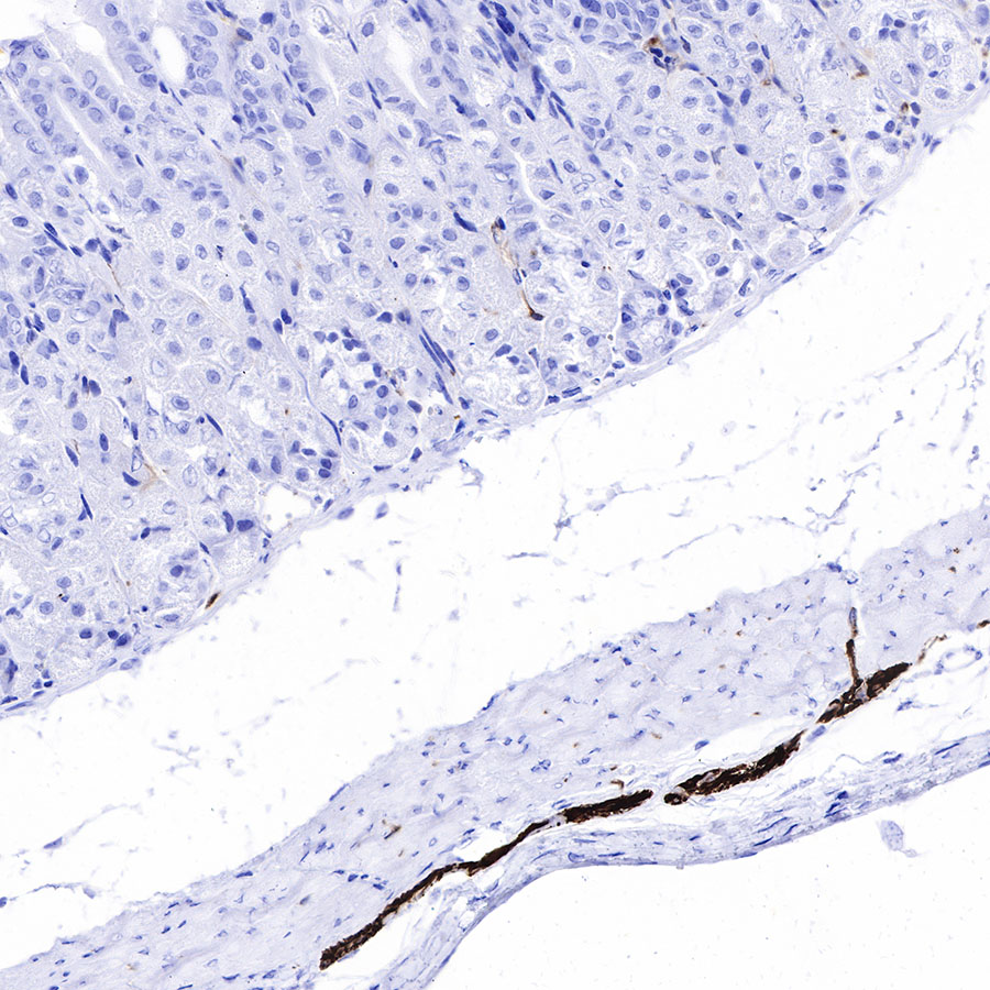 IHC shows positive staining in paraffin-embedded mouse stomach. Anti-GFAP antibody was used at 1/1000 dilution, followed by a HRP Polymer for Mouse & Rabbit IgG (ready to use). Counterstained with hematoxylin. Heat mediated antigen retrieval with Tris/EDTA buffer pH9.0 was performed before commencing with IHC staining protocol.