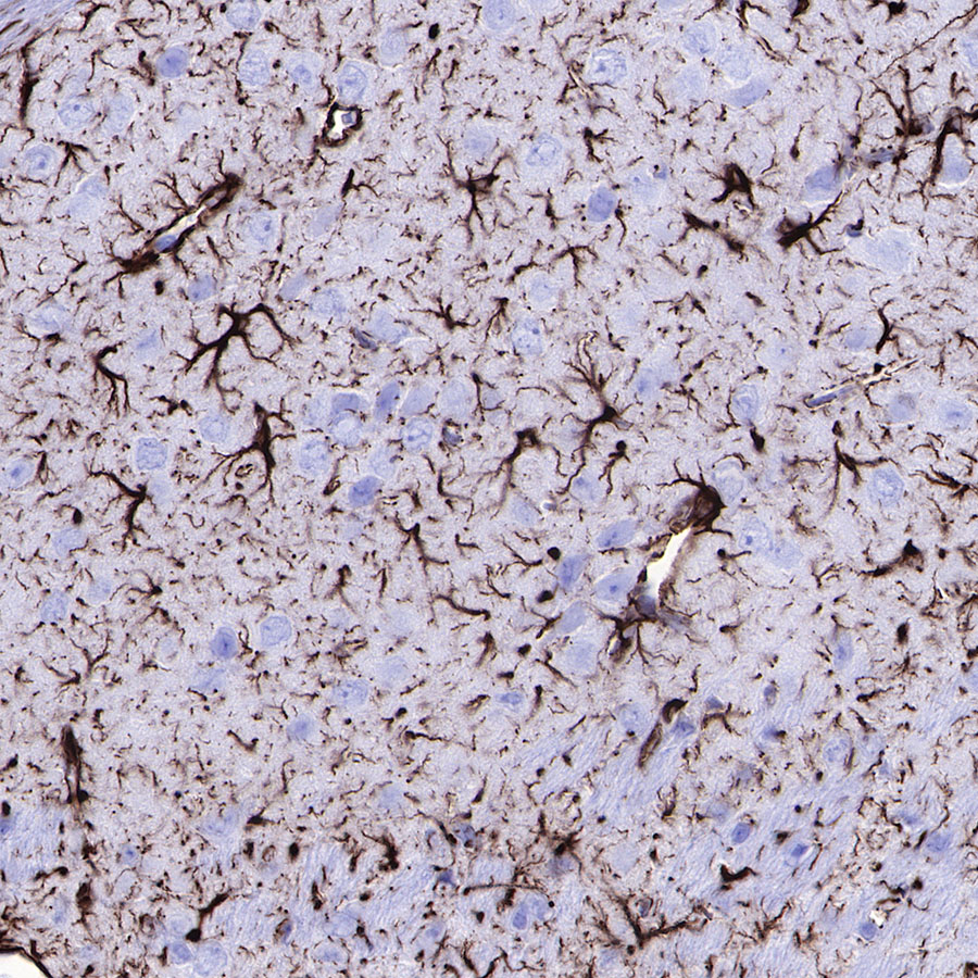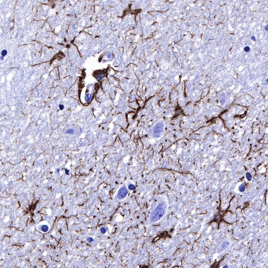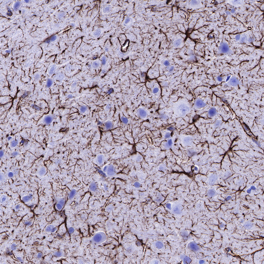 IHC shows positive staining in paraffin-embedded human cerebral cortex. Anti-GFAP antibody was used at 1/1000 dilution, followed by a HRP Polymer for Mouse & Rabbit IgG (ready to use). Counterstained with hematoxylin. Heat mediated antigen retrieval with Tris/EDTA buffer pH9.0 was performed before commencing with IHC staining protocol.