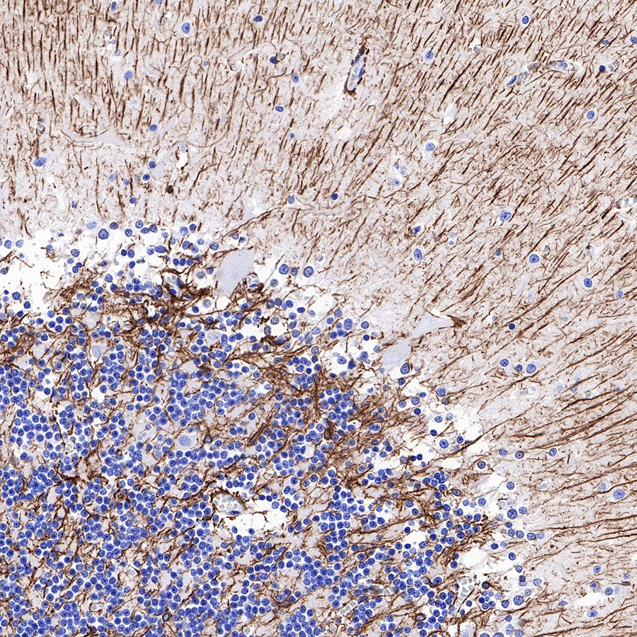 IHC shows positive staining in paraffin-embedded human cerebellum. Anti-GFAP antibody was used at 1/1000 dilution, followed by a HRP Polymer for Mouse & Rabbit IgG (ready to use). Counterstained with hematoxylin. Heat mediated antigen retrieval with Tris/EDTA buffer pH9.0 was performed before commencing with IHC staining protocol.