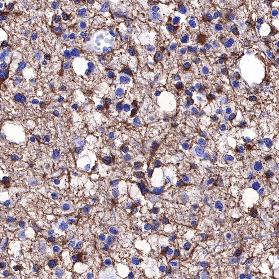 IHC shows positive staining in paraffin-embedded human astrocytoma. Anti-GFAP antibody was used at 1/1000 dilution, followed by a HRP Polymer for Mouse & Rabbit IgG (ready to use). Counterstained with hematoxylin. Heat mediated antigen retrieval with Tris/EDTA buffer pH9.0 was performed before commencing with IHC staining protocol.