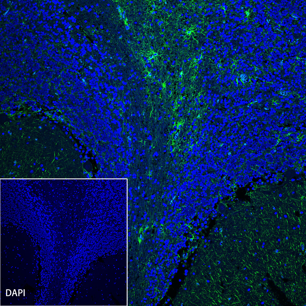 IF shows positive staining in paraffin-embedded mouse cerebellum. Anti-GFAP antibody was used at 1/2000 dilution (Green) and incubated overnight at 4°C. Goat polyclonal Antibody to Rabbit IgG - H&L (Alexa Fluor® 488) was used as secondary antibody at 1/1000 dilution. Counterstained with DAPI (Blue). Heat mediated antigen retrieval with EDTA buffer pH9.0 was performed before commencing with IF staining protocol.