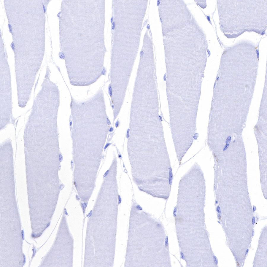 Negative control: IHC shows negative staining in paraffin-embedded human skeletal muscle. Anti-GFAP antibody was used at 1/1000 dilution, followed by a HRP Polymer for Mouse & Rabbit IgG (ready to use). Counterstained with hematoxylin. Heat mediated antigen retrieval with Tris/EDTA buffer pH9.0 was performed before commencing with IHC staining protocol.