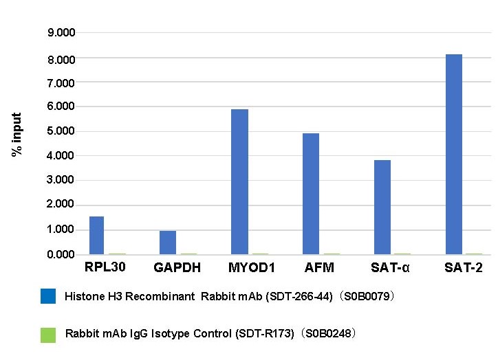 qPCR (%input: immunoprecipitated DNA/input DNA) showed the enrichment of RPL30, GAPDH, MYOD1, AFM, SAT-α and SAT-2 in Histone H3 Recombinant Rabbit mAb (SDT-266-44)-immunoprecipitated sample.