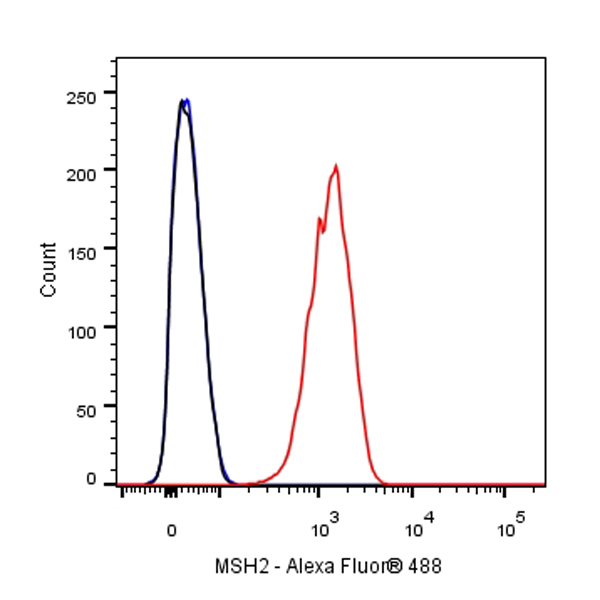 Flow cytometric analysis of 4% PFA fixed 90% methanol permeabilized HeLa (Human cervix adenocarcinoma epithelial cell) cells labelling MSH2 antibody at 1/250 (0.1 μg) dilution / (red) compared with a Rabbit monoclonal IgG (Black) isotype control and an unlabelled control (cells without incubation with primary antibody and secondary antibody) (Blue). Goat Anti - Rabbit IgG Alexa Fluor® 488 was used as the secondary antibody.