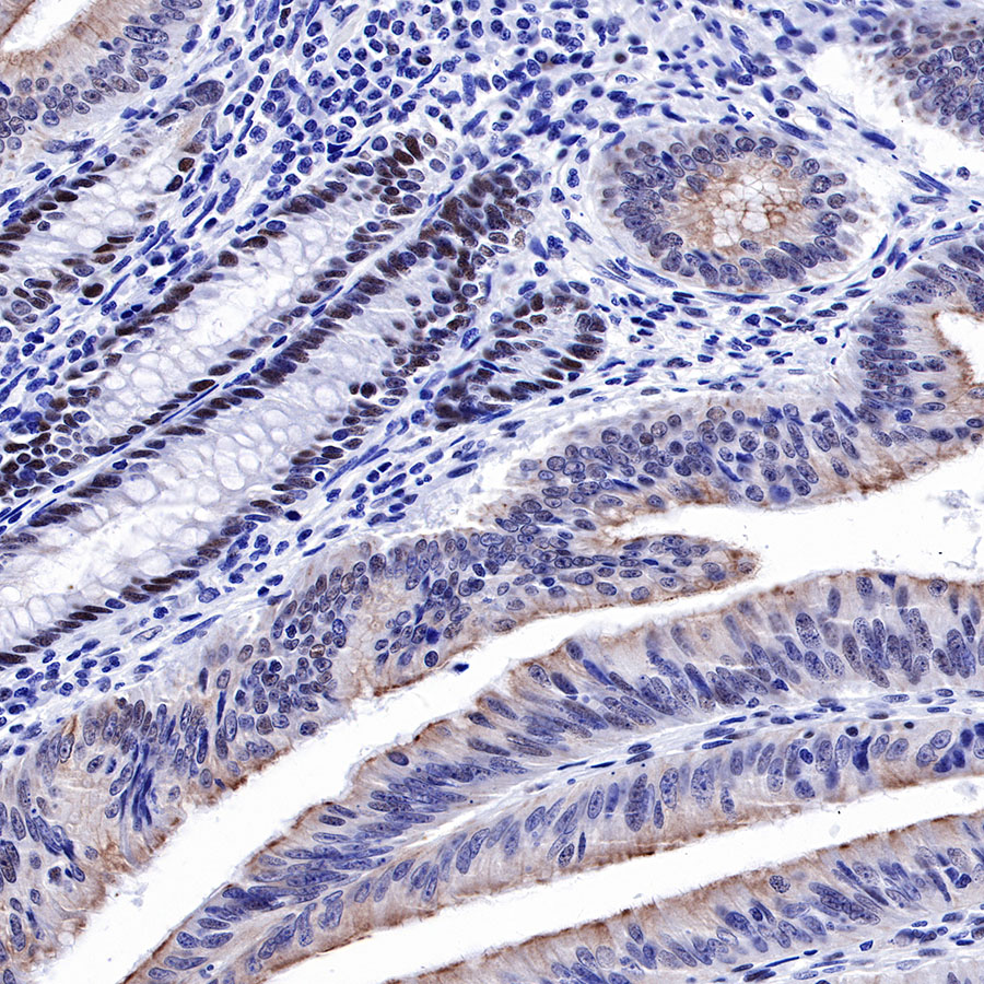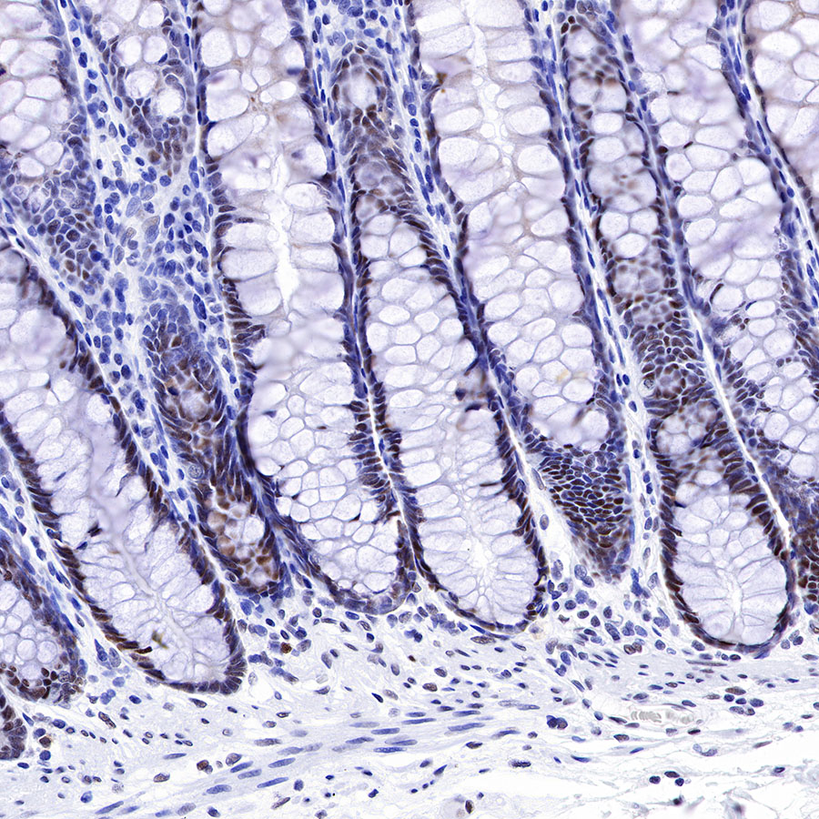 IHC shows positive staining in paraffin-embedded human colon. Anti-MSH2 antibody was used at 1/2000 dilution, followed by a HRP Polymer for Mouse & Rabbit IgG (ready to use). Counterstained with hematoxylin. Heat mediated antigen retrieval with Tris/EDTA buffer pH9.0 was performed before commencing with IHC staining protocol.