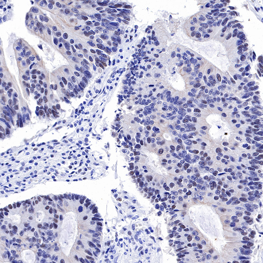 IHC shows positive staining in paraffin-embedded human colon cancer (Loss of MSH2 expression in individual tumor cells). Anti-MSH2 antibody was used at 1/2000 dilution, followed by a HRP Polymer for Mouse & Rabbit IgG (ready to use). Counterstained with hematoxylin. Heat mediated antigen retrieval with Tris/EDTA buffer pH9.0 was performed before commencing with IHC staining protocol.
