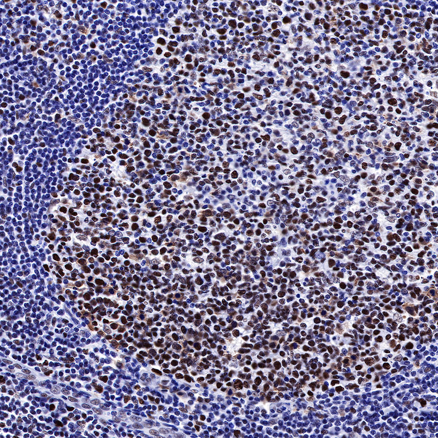 IHC shows positive staining in paraffin-embedded human tonsil. Anti-MSH2 antibody was used at 1/2000 dilution, followed by a HRP Polymer for Mouse & Rabbit IgG (ready to use). Counterstained with hematoxylin. Heat mediated antigen retrieval with Tris/EDTA buffer pH9.0 was performed before commencing with IHC staining protocol.